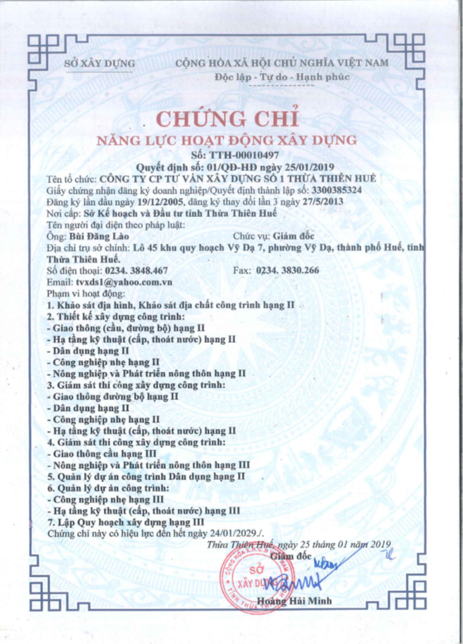 Chứng chỉ năng lực hoạt động xây dựng Khảo sát địa hình, Khảo sát địa chất công trình hạng II và Thiết kế xây fựng công trình hạng II &III